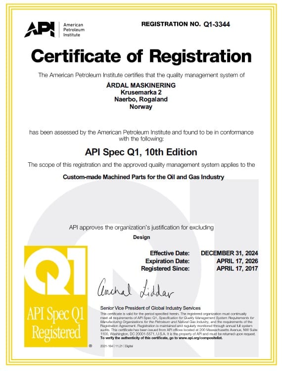 Certifications The company is certified according to API Q1 10. version and ISO 9001:2015. In addition, we have an API 7-2 license to apply monograms to API threads. . . Quality HSE CSR Certifications Sustainability Transparency